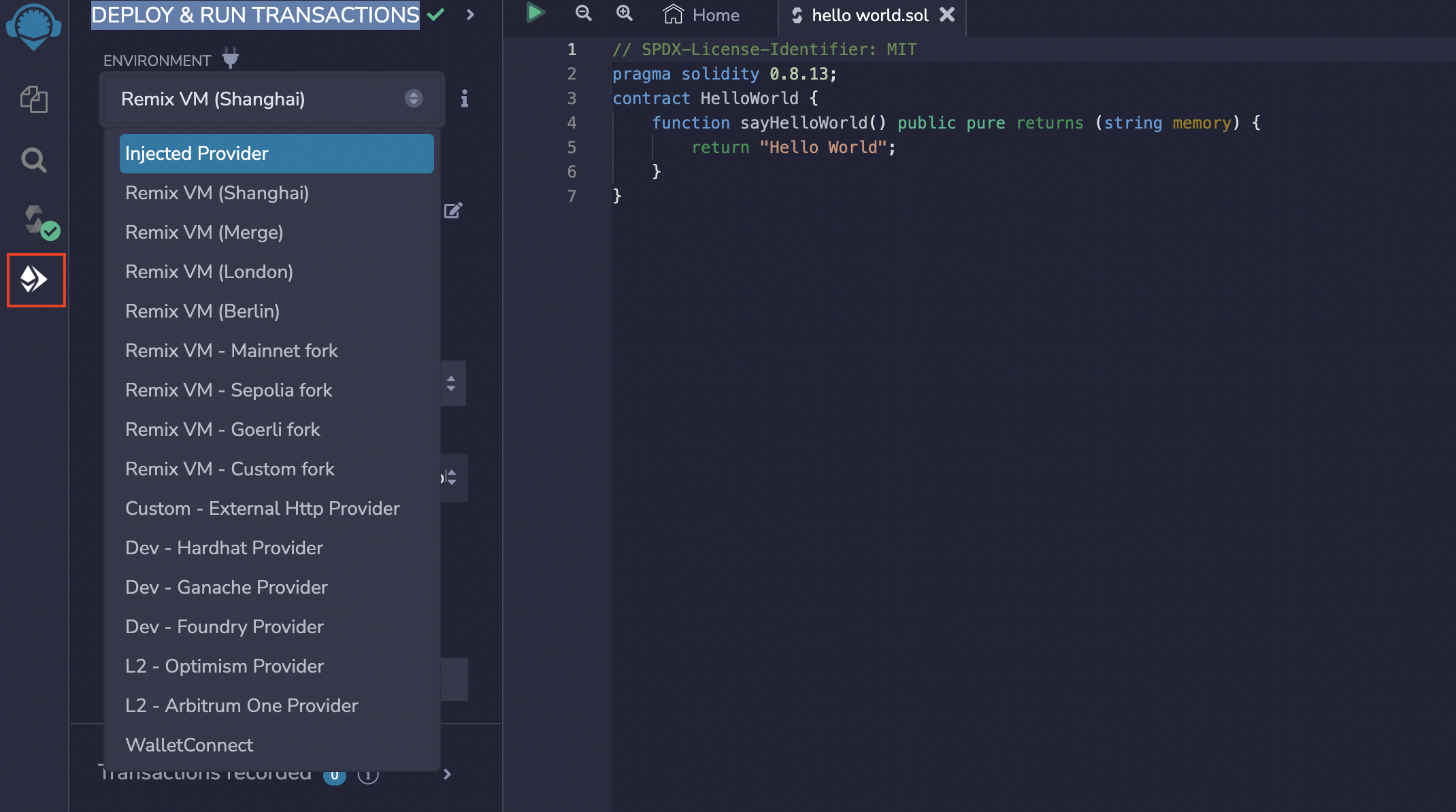 Navigate to Deploy & Run transactions Tab -> Open the "ENVIRONMENT" drop-down and select Injected Provider (make sure Core is loaded).